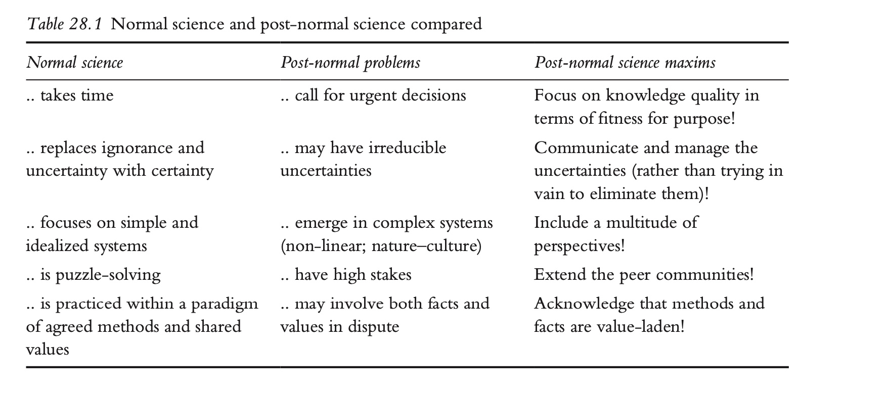 - Neben dem Perspektivismus von Ronald N. Giere denke ich an die Interpretationskonstrukte von Günter Abel / Hans Lenk, vor allem aber an die in Deutschland leider wenig bekannte Theorie der post-normal science (PNS), die Silvio O. Funtowicz Jerome R. Ravetz seit 1993 entwickelt haben (Science for the post-normal age, Futures 25 / 7, September 1993, 739-755). Das „Motto“ der PNS lautet when facts are uncertain, values in dispute, stakes high and decisions urgent – geradezu maßgeschneidert für die Covid-Situation. Objekt der PNS ist das Interface zwischen Wissenschaft und Politik, der Ansatz ist deutlich pragmatisch orientiert, wurde stark in der Umweltökonomie rezipiert (vor allem im romanischen und skandinavischen Sprachbereich) und dient als Referenz in Richtlinien für wissenschaftliche Politikberatung unter anderem der EU-Kommission (https://www.sapea.info/topics/making-sense-of-science/). Leider ist nicht absehbar, dass die Öffentlichkeit bei ihrer Diskussion der aktuellen Hyperprobleme Popper und Kuhn vom Sockel stößt und stattdessen Ravetz und Funtowitz zu ihren wissenschafts-polito-theoretischen Superstars erklärt. Einen aktuellen Überblick liefert Clive L. Spash, Post-Normal Science (https://www.routledgehandbooks.com/doi/10.4324/9781315679747.ch28 ) dem auch das folgende Bild entnommen ist.