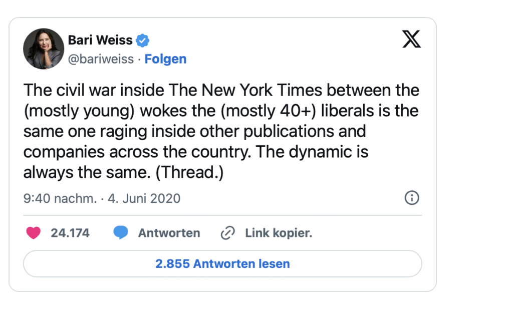 Eine Patentlösung wird es wohl kaum geben. Zumal dieses Dilemma ja kein rein theoretisches ist, es spielt sich unter konkreten historischen, kulturellen und sozialen Rahmenbedingungen ab. Darüber, was in der New York Times vorgefallen sein mag, gibt vermutlich recht gut ein tweet der Meinungsredakteurin Bari Weiss Auskunft, die beschreibt, dass innerhalb der Redaktion ein „Bürgerkrieg“ zwischen der jungen, „woken“ Generation und den klassischen Liberalen tobt, bei dem die ersten einen subjektiv gefärbten Haltungsjournalismus propagieren, die zweiten den auf Objektivität zielenden Neutralitätsjournalismus verteidigen. (Achtung: das Neue ist nicht zwangsläufig das Bessere.)